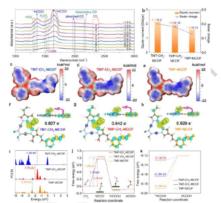 - 对TMP-CH3-MCOF在不同施加电位下的原位FT-IR光谱进行了测量,以确定CO2RR过程中的中间体。