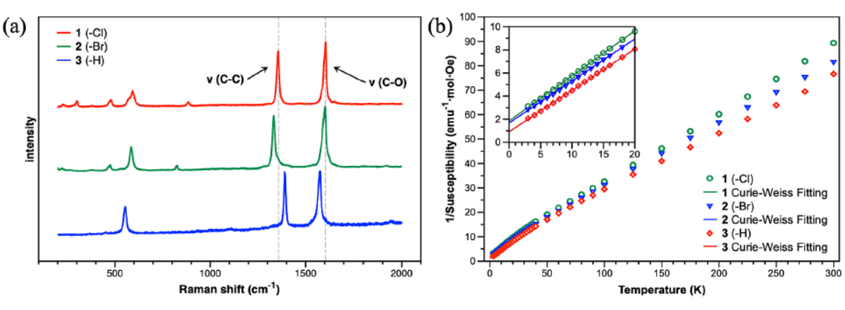 - 拉曼光谱用于确认配体的氧化状态,通过C−C和C−O振动模式的分析,确认了配体处于X2dhbq2−状态。