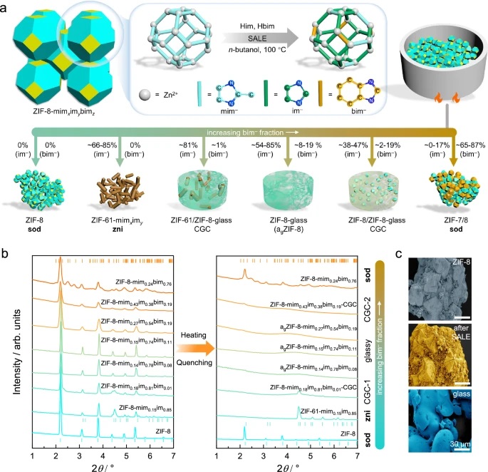 - 实验中,研究者采用了溶剂辅助连接体交换策略,将非熔融的ZIF-8与两种额外的有机连接体(imidazolate, im– 和 benzimidazolate, bim–)结合,制备了高多孔性的熔融淬灭MOF玻璃。