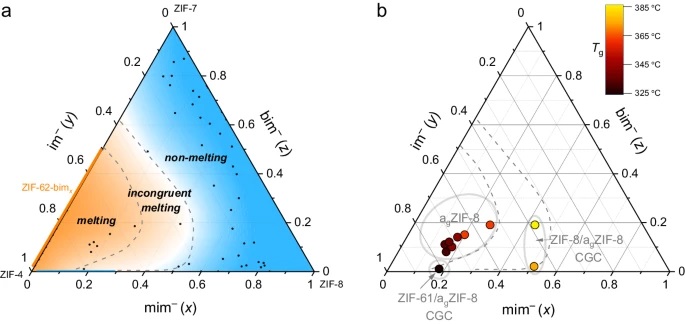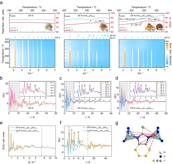 3. 本研究通过SALE方法在ZIF-8中引入了两种额外的有机连接体,imidazolate (im–)和benzimidazolate (bim–),实现了ZIF-8晶体的熔化和玻璃化。这种方法不仅使ZIF-8衍生物展现出了高孔隙率和高孔体积,还保持了MOFs的化学功能性。