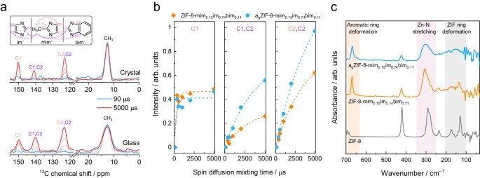 - 通过改变连接体的摩尔比和反应时间,合成了49种独特的连接体交换ZIF-8样品(ZIF-8-mimximybimz),并使用傅里叶变换红外光谱(FTIR)和固体核磁共振(NMR)光谱来确认连接体的交换。
