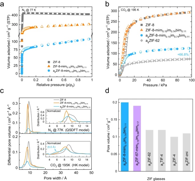 - N2和CO2的吸附等温线表明,agZIF-8-mim0.15im0.74bim0.11具有较高的孔隙率和特定的孔体积,与其他ZIF玻璃相比具有显著的吸附能力。