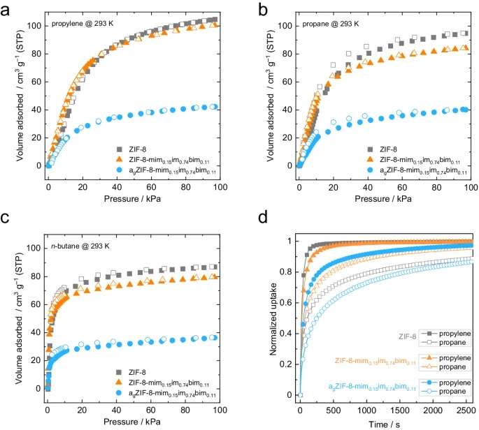 - 对ZIF-8, ZIF-8-mim0.15im0.74bim0.11和agZIF-8-mim0.15im0.74bim0.11进行了N2和CO2的吸附等温线测量,以及丙烯、丙烷和正丁烷的吸附实验,评估了材料的孔隙特性和吸附性能。