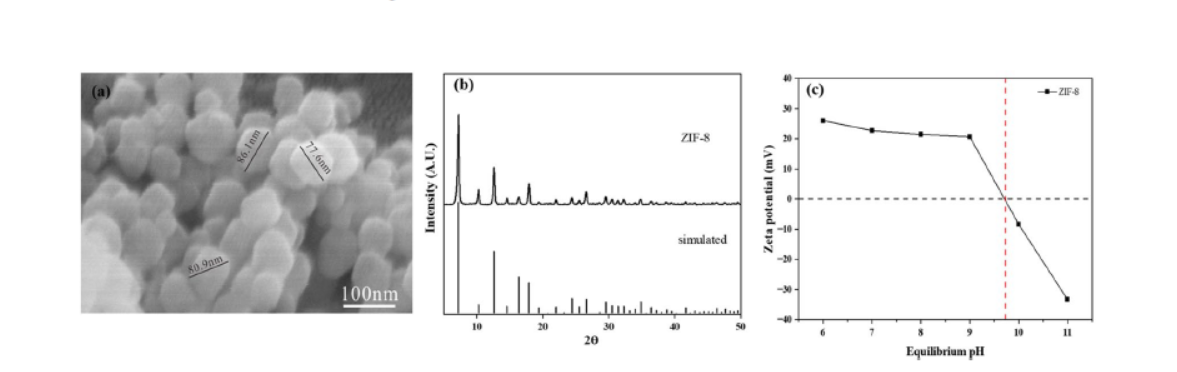 - 分析了ZIF-8纳米粒子的zeta电位,确定了ZIF-8的零电荷点(pHPZC)接近9.6。