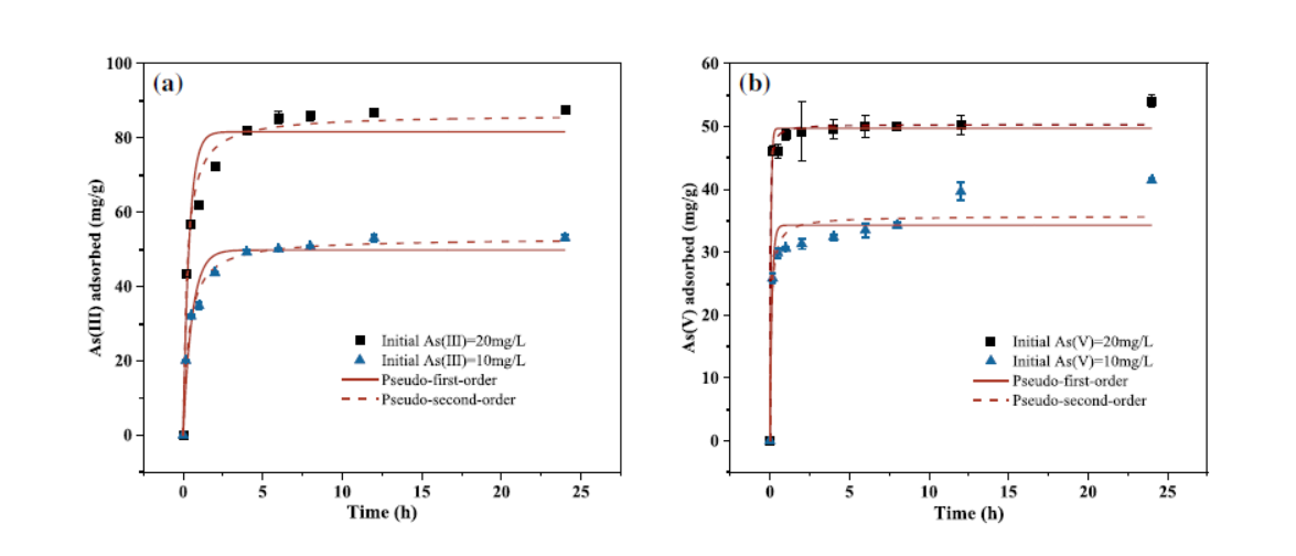 - 应用伪一阶和伪二阶模型拟合动力学吸附数据,结果显示伪二阶模型更适合。
