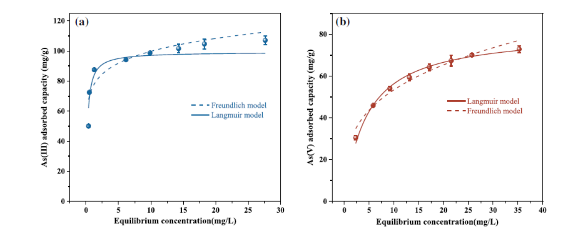 - 使用朗格缪尔模型和弗伦德里希模型拟合等温吸附数据,朗格缪尔模型更符合实验结果,表明As(III)和As(V)在ZIF-8表面的单分子层吸附。