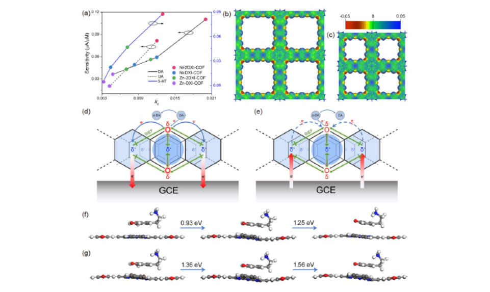 中国石油大学陈文淼&陈艳丽&德州学院张跃兴&北京科技大学姜建壮老师等报道的本篇文章(Sci. China Chem. 2024)中报道了一种通用合成方法,用于制备金属酞菁基二维共价有机框架(MPc-nDXI-COFs),这些框架作为超灵敏的多功能电化学传感器,能够检测多种分析物,包括神经递质、有机污染物和重金属离子。通过简便的微量喹啉辅助一锅法缩合反应,成功合成了高产量(80%-96%)的MPc-nDXI-COFs。实验和计算结果表明,与DXI连接的MPc-DXI-COFs相比,2DXI连接的MPc-2DXI-COFs具有更强的内置电场和更多的静电/氢键吸附位点,以及更低的电极反应吉布斯自由能和更强的分析物吸附能力。特别是NiPc-2DXI-COF表现出对各种分析物的优异的检测性能,具有高灵敏度和低检测限(0.53至25.66 nM)。此外,即使在实际应用条件下,也能实现二元和三元体系中多种分析物的同时检测。