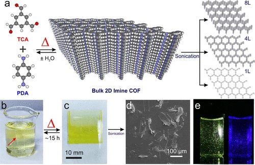 2. 通过保持席夫碱缩合反应的准平衡状态(约15小时),在p-苯二胺(PDA)和苯-1,3,5-三醛(TCA)分子之间形成高晶性的二维亚胺聚合物薄膜。利用超声剥离技术从2D-COF聚合物中获得自支撑的薄层和超薄层亚胺-COF薄膜。
