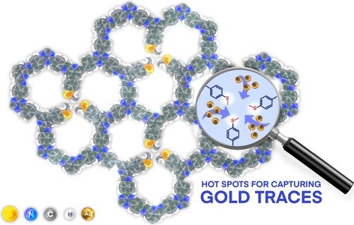 New York University 的Abu Dhabi Ali Trabolsi等报道的本篇文章(ACS Appl. Mater. Interfaces 2024)中针对全球对金的需求和消费不断增长,提出了一种从非传统矿藏,尤其是水中提取金的新方法。作者开发了一种含硫的共价有机框架(COF),通过三嗪基三胺与芳香二醛的缩合反应形成含有噻喃基团的孔洞,这些孔洞作为有效的螯合剂与Au3+离子结合。该材料在短时间内(2分钟内)对9 ppm的Au3+溶液的吸附率超过99%,表现出快速的动力学,并具有245 mg·g−1的高去除容量,对金离子具有明显的选择性。此外,该材料甚至能在1 ppb的低浓度下捕获金。