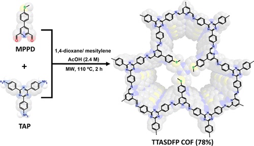 1. 合成TTASDFP:作者通过微波辐射的方法合成了含硫的共价有机框架材料TTASDFP,使用了4-(4-(甲基硫)苯基)吡啶-2,6-二甲醛(MPPD)与2,4,6-三(4-氨基苯基)-1,3,5-三嗪(TAP)进行缩合反应,以形成亚胺键。合成过程持续了2小时,产率为78%。