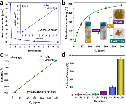 2. 金离子吸附性能测试:在室温下,作者评估了TTASDFP从水中去除痕量Au3+的性能。首先研究了金离子的吸附动力学,将TTASDFP置于9 ppm的Au3+水溶液中,结果显示98.7%以上的金离子在30秒内被去除,浓度降至十亿分之一水平。