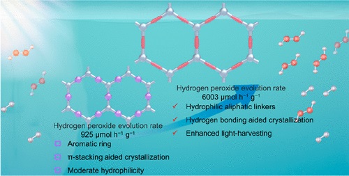 本文通过使用脂肪族连接体成功构建了具有高亲水性、结晶性和光收集能力的COFs。这些COFs在光催化H2O2产生方面展现出了前所未有的活性,为光催化COFs的开发提供了新的方向。