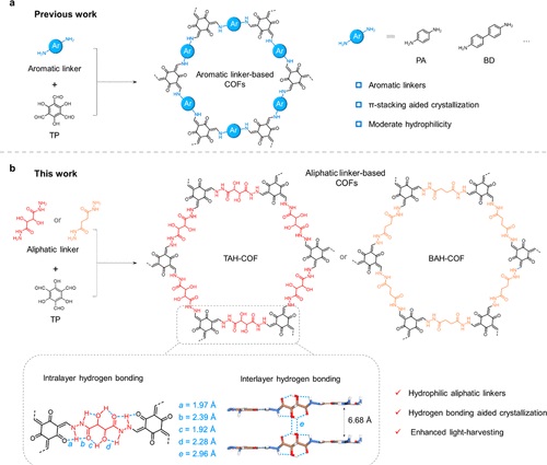 1)传统的光催化COFs通常由刚性芳香族连接体构建,虽然有利于结晶性和π共轭,但芳香族骨架的疏水性限制了它们在水基光催化反应中的性能。