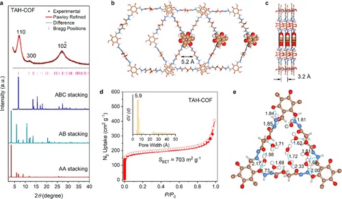 1. 比表面积和孔径分析:通过氮气吸附-脱附等温线测量,TAH-COF的BET比表面积为703 m2 g−1,平均孔径为5.9 Å。BAH-COF的BET比表面积为530 m2 g−1,孔径分布与TAH-COF一致。