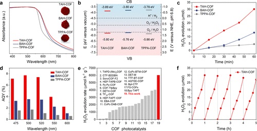 3. 光吸收性能:TAH-COF和BAH-COF的光吸收边缘超过800 nm,与芳香族连接体TPPA-COF相比,它们的吸收起始点红移了43 nm和40 nm。