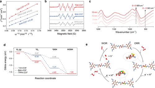 5. 光催化H2O2产生机制:通过旋转圆盘电极(RDE)测试、电子顺磁共振(EPR)光谱和原位傅里叶变换红外光谱(FT-IR)分析,揭示了TAH-COF在光催化H2O2产生中的两步单电子途径。