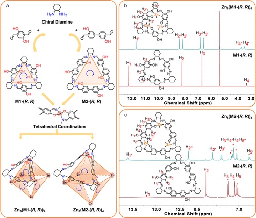 1. 合成实验:作者合成了两种手性纯的八面体金属-有机多面体(MOPs),分别为Zn6(M1-(R, R))4 和 Zn6(M2-(R, R))4,使用trianglsalen大环化合物作为预组织的构建块,与Zn(II)离子自组装形成。实验中,M1-(R, R) 和 M2-(R, R) 的合成分别使用了不同的反应物和溶剂,并通过核磁共振(NMR)和质谱(MS)确认了它们的结构。