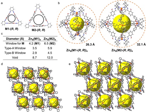 本文通过自组装策略成功合成了两种新型的手性多孔MOPs,这些MOPs继承了大环构建块的手性,并展示了可调节的孔隙性和在水中的稳定性。特别是Zn6(M1-(R, R))4在分离Xe和Kr方面表现出了优异的性能,为稀有气体的分离提供了新的材料选择。
