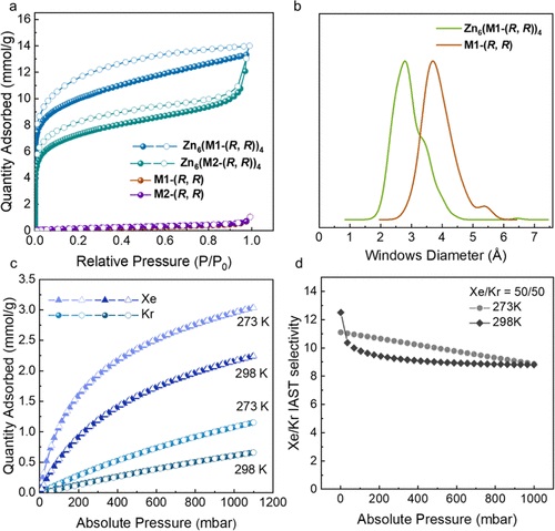 6. 气体吸附等温线:N2吸附等温线测试揭示了MOPs的微孔填充特性,同时Xe和Kr的吸附等温线测试表明Zn6(M1-(R, R))4 对这两种气体具有较高的吸附容量。