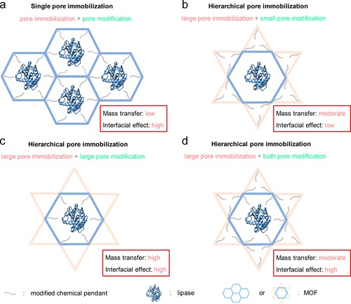 3)本文作者提出了一种金属-有机框架(MOF)孔道工程策略,通过精确修饰孔道,同时实现了酶稳定性和活性的提升。特别是利用链长可调的脂肪酸对介孔通道进行修饰,捕获了脂肪酶,并通过界面相互作用激活酶的开放构象。