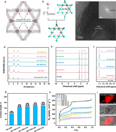 4) 脂肪酸修饰的MOF孔道:利用溶剂辅助配体掺入(SALI)方法,将直链脂肪酸精确修饰到NU-1003的介孔壁上,合成了不同链长的脂肪酸修饰的NU-1003-X(X = C12, C16, C20, C22)。