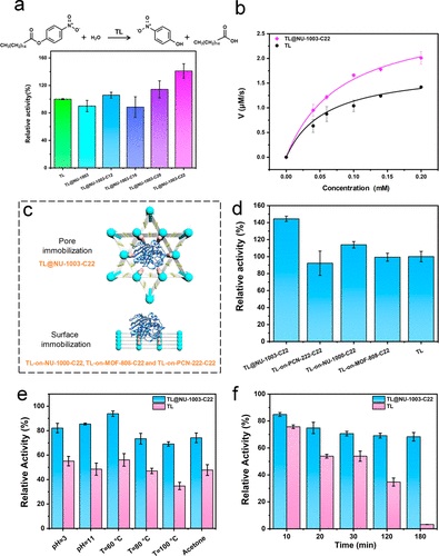 3) 催化性能测试:使用对硝基苯基棕榈酸酯(p-NPP)作为底物,评估了TL@NU-1003和TL@MCM-41的催化水解动力学。TL@NU-1003展现出与游离TL相当的初始水解速率,比TL@MCM-41高出1.52倍。