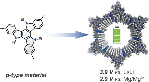Ulm University的 Birgit Esser和University of Freiburg的 Albertstr Oliver Dumele等报道的本篇文章(J. Am. Chem. Soc. 2024)中报道了一种新型的p型多孔且结晶的氮杂三叶草烯基共价有机框架(COF),并将其应用于锂基和镁基电池的正极材料。在锂基半电池中,该材料作为COF/碳纳米管(CNT)电极,展现出3.9V的放电电位和高达70mAh/g的放电容量。在采用四(六氟异丙氧基)硼酸盐电解质的镁电池中,平均放电电压为2.9V,即使在5C的高电流速率下,1000个循环后容量保持率也达到84%。文章强调了这种材料在多价离子电池中的潜力,尤其是在提高电池电压和速率性能方面。