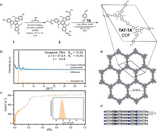 - PXRD结果显示了TAT-TA COF的高结晶性,通过Pawley细化与六角晶系P6/m空间群的模拟模型吻合良好,晶格参数a=b=37.5 Å,c=4.0 Å。