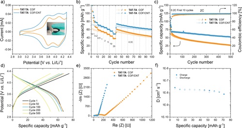 - 在2 C的倍率下,TAT-TA COF/CNT电极显示出68 mAh g−1的放电容量,在500个循环后保持率为76%。