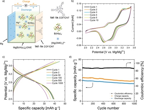 - 使用0.3M Mg[B(hfip)4]2·3DME在1,2-二甲氧基乙烷(DME)中的溶液作为电解液,测试了TAT-TA COF/CNT电极在镁电池中的性能。在5C的高电流密度下,电池显示出2.9V的平均放电电压,并且在1000个循环后容量保持率为84%。
