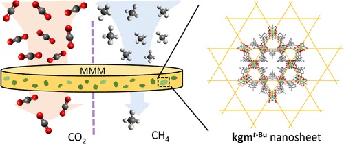 University of Manchester 的Martin Schröder&北京大学杨四海老师等报道的本篇文章中(ACS Appl. Mater. Interfaces 2024)报道了一种新型的混合基质膜技术,该技术利用高纵横比和尺寸选择性气体传输特性的金属-有机框架(MOF)材料纳米片,以促进组分的有效混合形成用于气体分离的膜。通过溶剂和调节剂的选择控制层状结构的生长,合成了平均厚度20nm、纵横比40-50的kagome(kgm)拓扑结构的kgmt-Bu纳米片。这些纳米片在分离CO2和CH4方面表现出色,与颗粒形式的MOF相比,其在Matrimid中的混合基质膜的CO2/CH4选择性提高了32%。