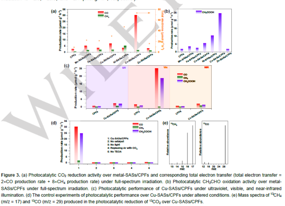 3. 金属-SASs/CPFs的光催化性能评估:在全光谱照射下,对CO2还原和CH3CHO氧化进行了光催化实验。Cu-SASs/CPFs表现出最高的CO2还原为CO的活性(约30.3 μmol·g^-1·h^-1)和CH3CHO氧化为CH3COOH的活性(约24.7 μmol·g^-1·h^-1),远超过其他金属-SASs/CPFs。