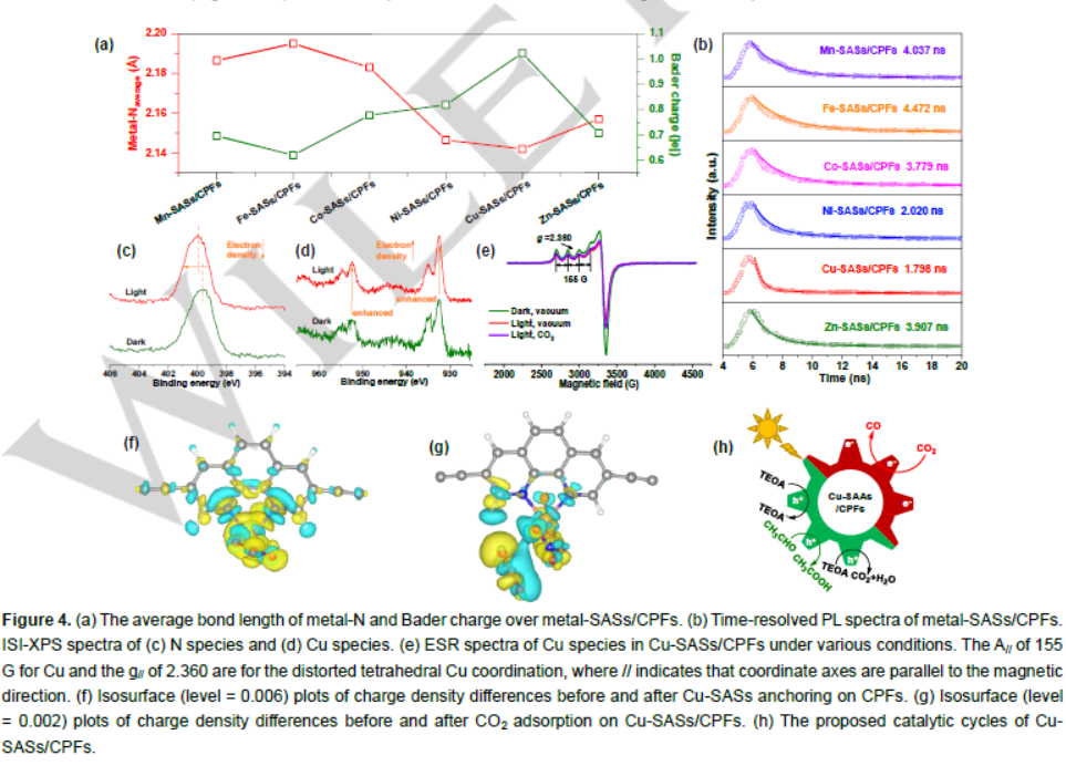 6. 光催化反应机理的探究:通过时间分辨荧光(PL)光谱、Bader电荷计算、原位红外(DRIFTIR)光谱和电子自旋共振(ESR)技术,揭示了Cu-SASs/CPFs中电子-空穴对的产生、分离和转移过程,以及CO2还原和CH3CHO氧化的反应中间体。