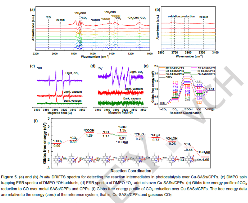5. 反应中间体的检测:使用原位DRIFTIR光谱和ESR技术检测了光催化过程中的反应中间体,如*CO2、*OH和*O2-,为理解光催化机制提供了直接证据。