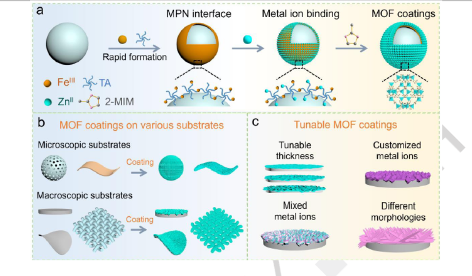 1. 晶体MOFs因其高比表面积、有序多孔结构和由金属离子及有机配体带来的混合物理化学性质而受到广泛关注。然而,它们的实际应用通常需要与各种基材集成,这由于MOFs的弱粘附性和基材性质的多样性而面临挑战。