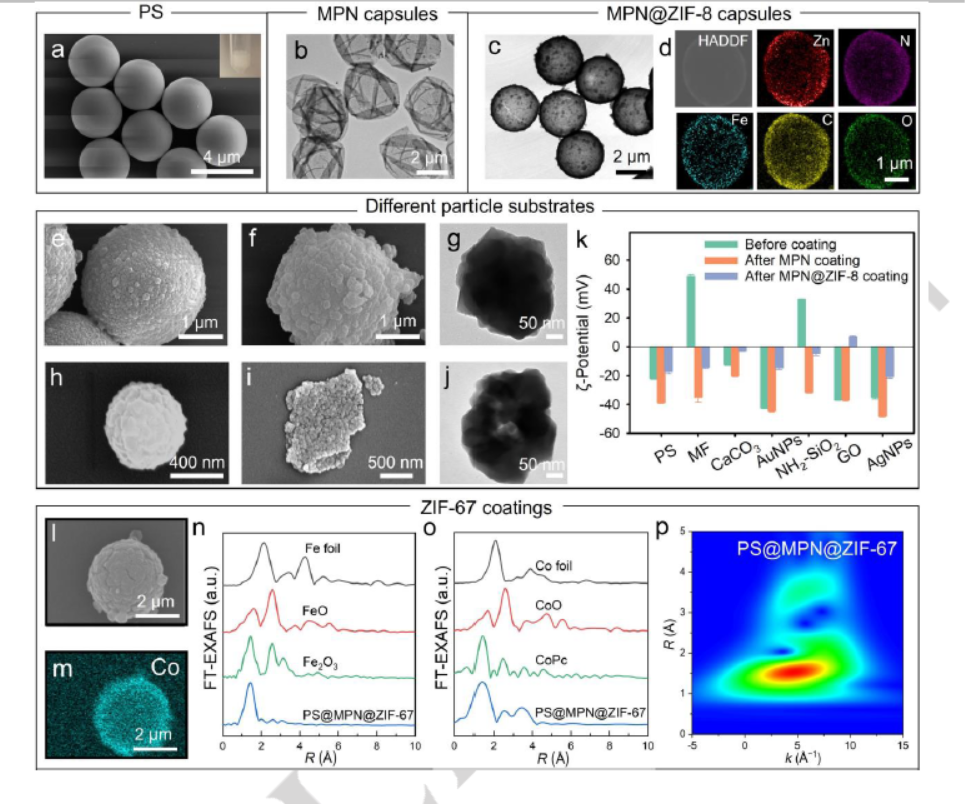 - 在MPN改性的PS微粒上继续添加ZIF-8前驱体(硝酸锌六水合物和2-甲基咪唑),在室温下生长出连续的晶体MOF涂层。