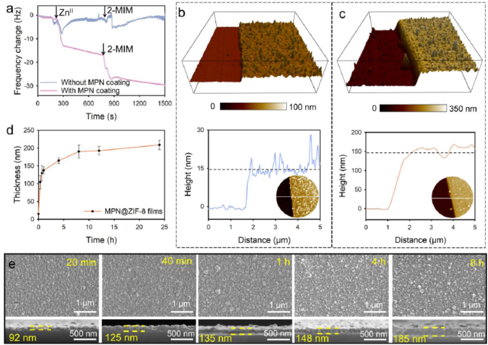 - AFM图像显示MPN初始沉积在硅片上形成约15 nm厚的界面层,随后ZIF-8涂层增厚至约150 nm。