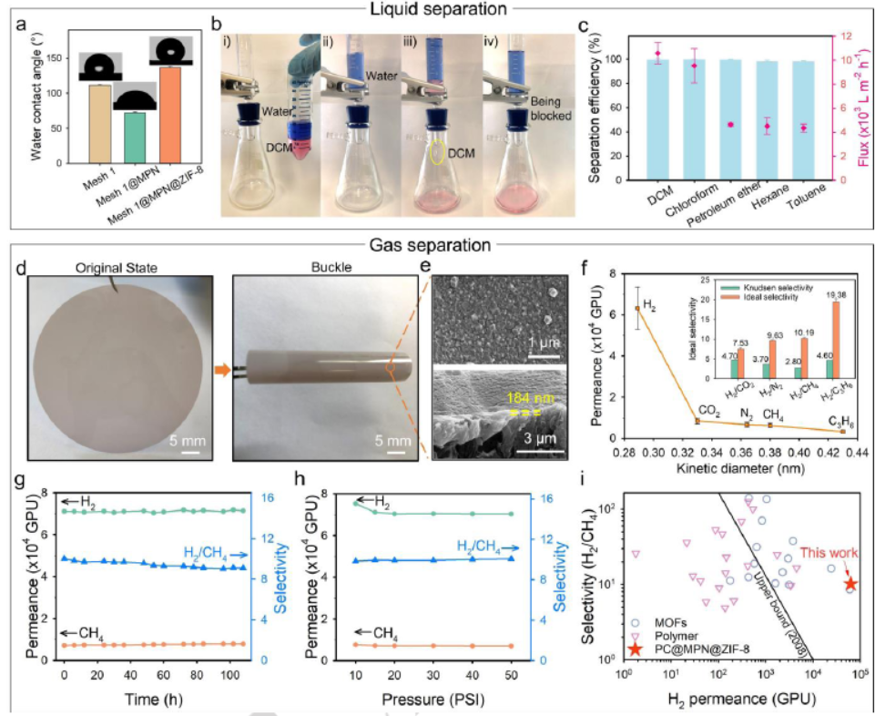 - 液体分离实验中,DCM-水混合物通过MPN@ZIF-8膜分离,DCM的渗透率达到10574 L m–2 h–1,分离效率为99.5%。