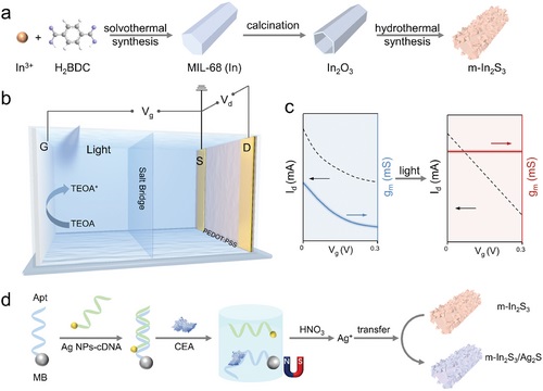 南京大学赵伟伟和徐静娟老师等报道的本篇文章(Adv. Funct. Mater. 2024, 2405913)中作者们针对有机电化学晶体管(OECT)生物传感器在不同浓度目标检测过程中遇到的跨导(transconductance, gm)不稳定问题,提出了一种解决方案。通过使用一种独特的金属有机框架(MOF)衍生的空心管状铟硫化物(m-In2S3)作为光电门控材料,实现了在光照条件下产生稳定gm的OECT。这种稳定的gm对于生物检测应用是非常理想的。实验中,以核酸酶为模型,测试了该装置在蛋白质定量检测中的稳定性能。这项工作展示了光-物质相互作用在实现有机电子设备中稳定gm方面的潜力。