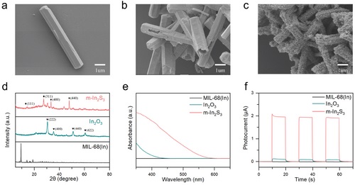- 使用扫描电子显微镜(SEM)观察了MIL-68(In)、In2O3和m-In2S3的形态,发现m-In2S3具有粗糙表面和纳米立方体聚集结构。