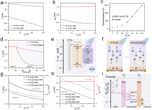- 研究了m-In2S3门控OPECT在光照条件下的跨导变化,发现光照下跨导值稳定在约1.23 mS,与无光照条件下的跨导显著不同。