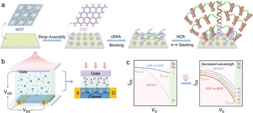 青岛科技大学范高超&南京大学赵伟伟老师等报道的本篇文章(Adv. Funct. Mater. 2024, 2404497)中探讨了在有机光电化学晶体管(OPECT)中实现高开关比(IOn/IOff)的重要性,并提出了一种通过光敏COF-LZU1修饰的混合配体MOF(COF-on-MOF)来实现类似Ag/AgCl的光门控效应。这种COF-on-MOF异质结构在适当的光照下,能够显著调节器件物理特性,优化IOn/IOff比,增强信号转导。此外,该设备通过核酸外切酶辅助循环扩增和杂交链反应,被验证具有对人类T细胞白血病病毒II型(HTLV-II) DNA高度敏感的检测能力,检测下限达到0.003 fM。研究展示了通过光-物质相互作用实现有机晶体管光门控的可能性。