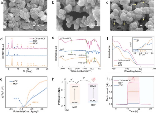 5) 光电流测量:在425 nm光照下,COF-on-MOF显示出比原始COF更强的光电流,表明了其更好的光电效率。