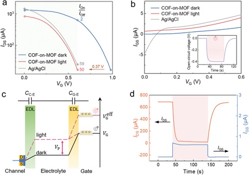6) 转移特性和栅电流测试:在光照条件下,COF-on-MOF的转移特性和栅电流与Ag/AgCl电极相似,表明了COF-on-MOF具有类似Ag/AgCl的调制效果。