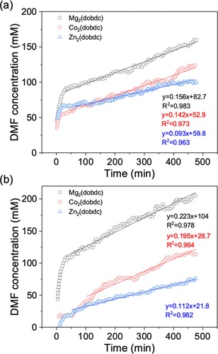 1) 合成实验:研究者合成了M2(dobdc)(M=Mg, Co, Zn)系列的金属-有机框架(MOFs),并使用N,N-二甲基甲酰胺(DMF)、乙醇(EtOH)和甲醇(MeOH)作为交换溶剂,以研究溶剂从MOFs中的释放和交换动力学。