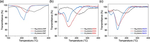 3) TGA-IR分析:通过热重分析耦合红外光谱,确定了溶剂分子从MOFs中的释放温度,表明DMF、EtOH和MeOH对M2(dobdc)的结合强度顺序为Mg > Co > Zn。
