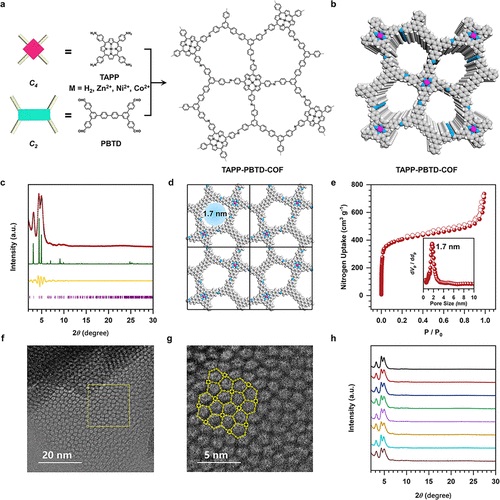 - 通过粉末X射线衍射(PXRD)分析,确定了TAPP-PBTD-COF的晶体结构,观察到的特征衍射峰与理论模拟高度一致。