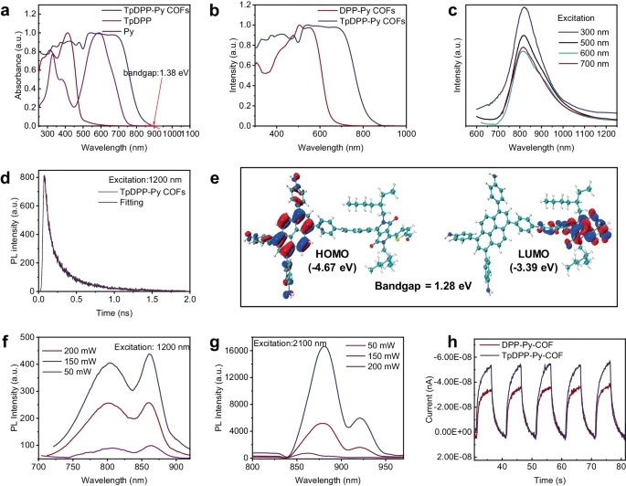 - TpDPP-Py COFs在200至900 nm范围内展现了宽吸收峰,PL光谱显示在810 nm处有发射峰。