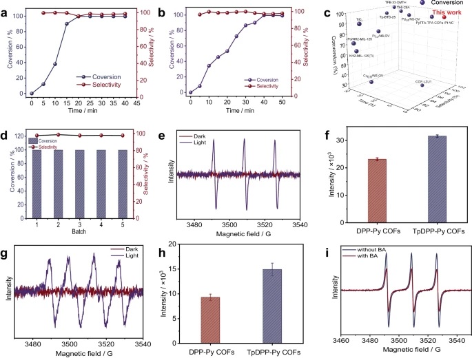 - EPR检测确认了在光照下TpDPP-Py COFs能够产生单线态氧(1O2)。