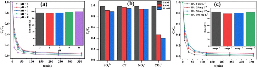 2. 共存阴离子:高浓度的SO42−, Cl−和NO3−降低了kobs值,但对总去除率影响有限。